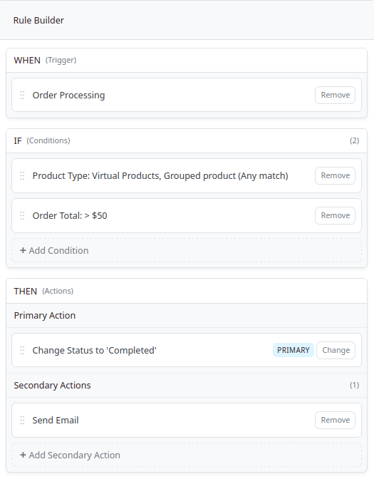 Th Rule Builder is the central control panel where you define the specific logic for exactly when an order should be automatically completed.
